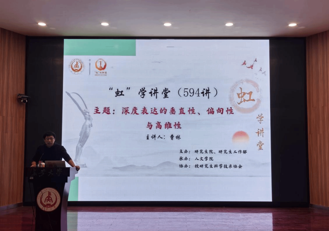 11月9日下午,由研究生院、研究生工作部主办,人文学院承办,校研究生科学技术协会协办的“虹”学讲堂第594讲在南校区东院伯声报告厅举办。华中科技大学曹林教授作题为“深度表达的垂直性、偏向性与高维性”的报告,人文学院杜波教授主持报告会,相关学院共110余名师生参加讲座。