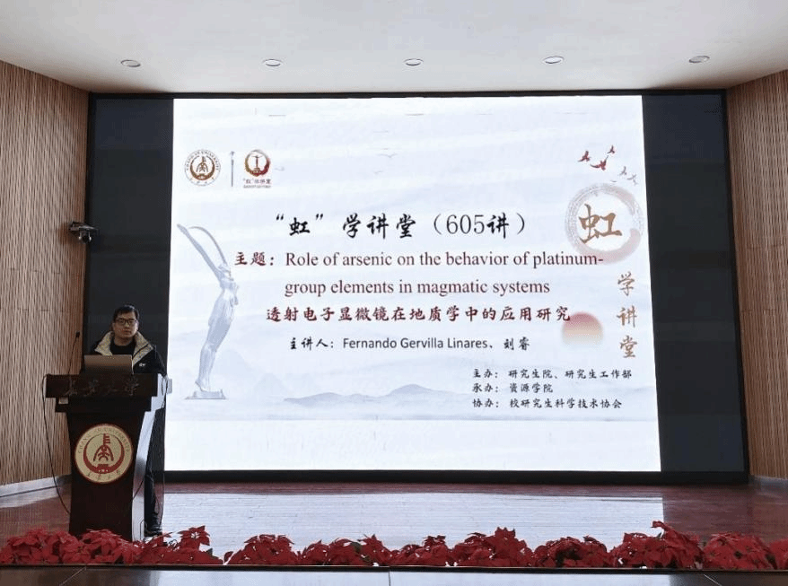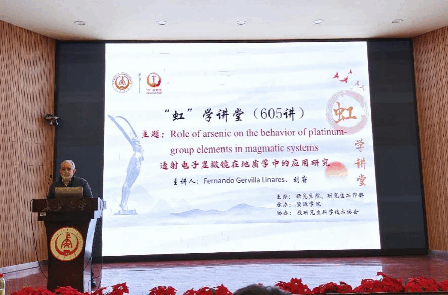 12月2日上午,由研究生院、研究生工作部主办,地球科学与资源学院承办,校研究生科学技术协会协办的“虹”学讲堂第605讲在南校区东院伯声报告厅举办。西班牙格拉纳达大学Fernando Gervilla Linares教授、山东理工大学刘睿副教授分别作了题为“Role of arsenic on the behavior of platinum-group elements in magmatic systems”“透射电子显微镜在地质学中的应用研究”的报告,相关学院共120余名师生参加讲座。