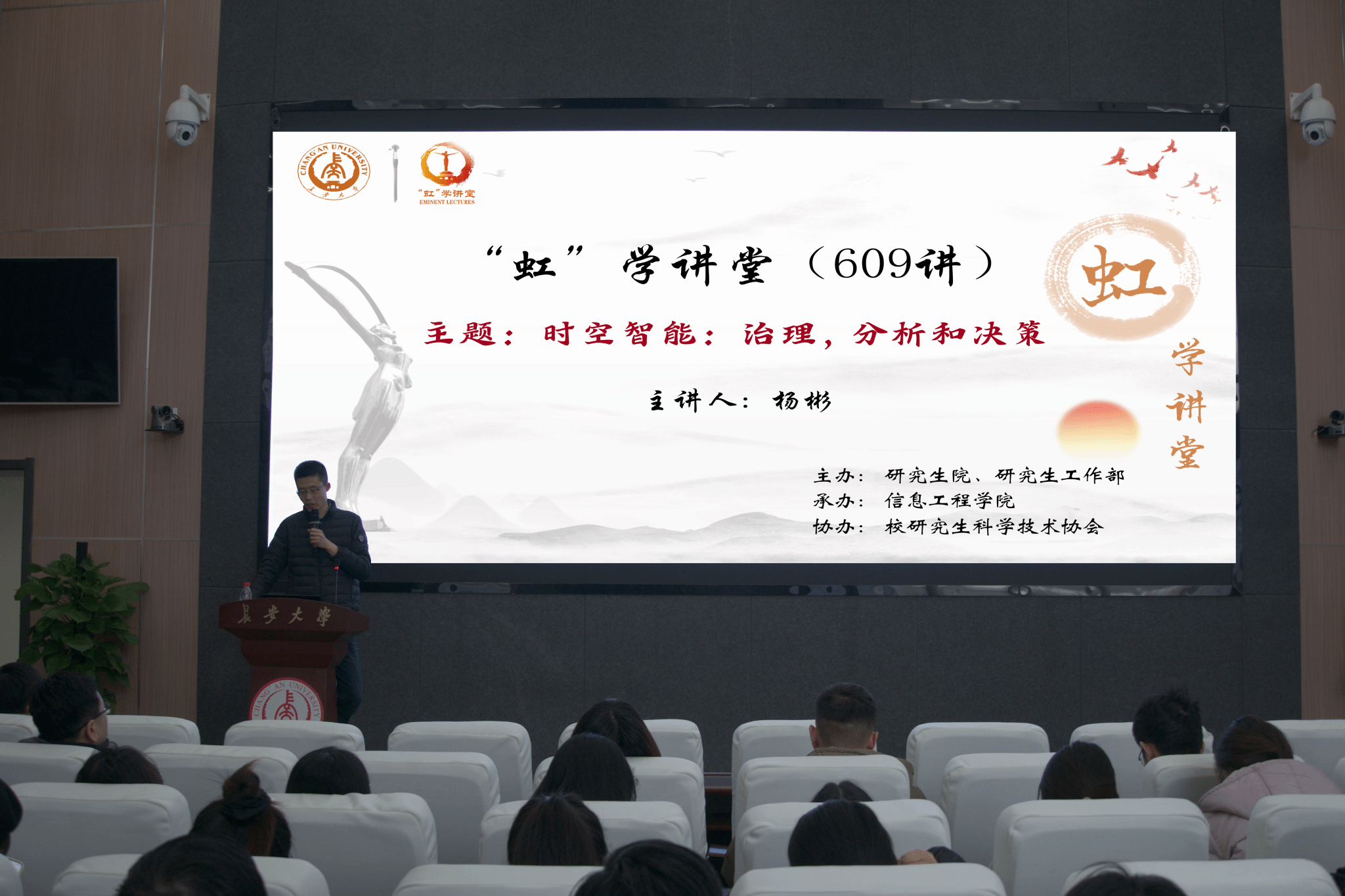 1月3日下午,由研究生院、研究生工作部主办,信息工程学院承办,校研究生科学技术协会协办的“虹”学讲堂第609讲在北校区师生服务大厅第二报告厅举办。华东师范大学杨彬教授作题为“时空智能:治理、分析和决策”的报告,信息工程学院孙琛琛副教授主持报告会,相关学院共160余名师生参加讲座。