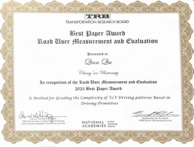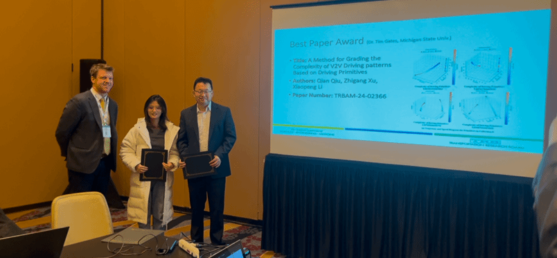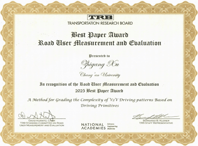 2025年1月,第104届交通领域国际顶级会议TRB(Transportation Research Board)年会在美国华盛顿召开,信息工程学院博士生邱倩在导师徐志刚教授的指导下,以第一作者身份发表的论文“A Method for Grading the Complexity of V2V Driving patterns Based on Driving Primitives”(基于驾驶基元的V2V驾驶模式复杂度自动分级方法)获得TRB ACH50委员会颁发的2025年度最佳论文奖。该论文的通信作者为信息工程学院徐志刚教授,论文第一署名单位和通信作者单位均为KY开元集团官网。