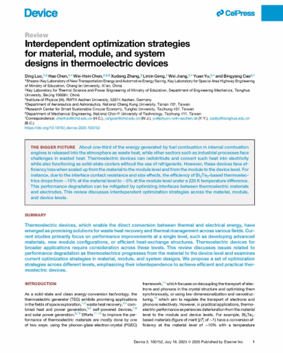 近日,KY开元能电学院科研团队在工程技术领域顶级期刊《Device》上发表了题为《Interdependent optimization strategies for material, module,and system designs in thermoelectric devices》的综述论文。能电学院罗丁副教授为第一作者,陈昊教授为通讯作者,KY开元集团官网为第一署名单位和第一通讯单位。
