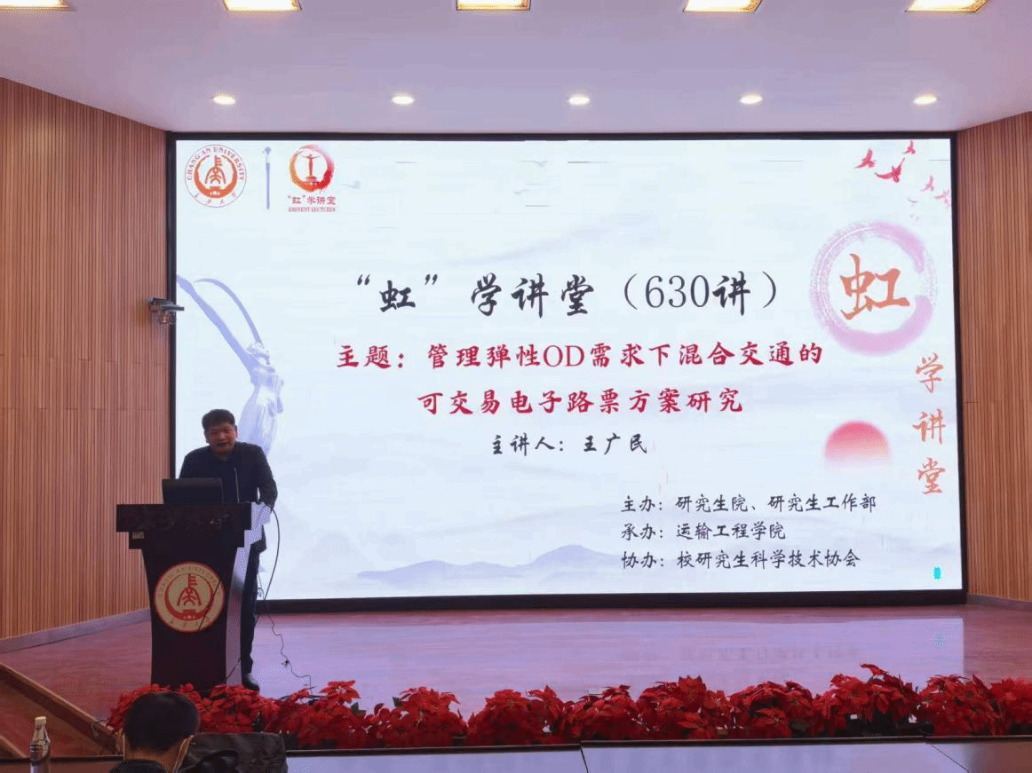 4月18日下午,由研究生院、研究生工作部主办,运输工程学院承办,校研究生科学技术协会协办的“虹”学讲堂第630讲在南校区东院伯声报告厅举办。中国地质大学王广民教授作题为“管理弹性OD需求下混合交通的可交易电子路票方案研究”的报告,相关学院共143余名师生参加讲座。