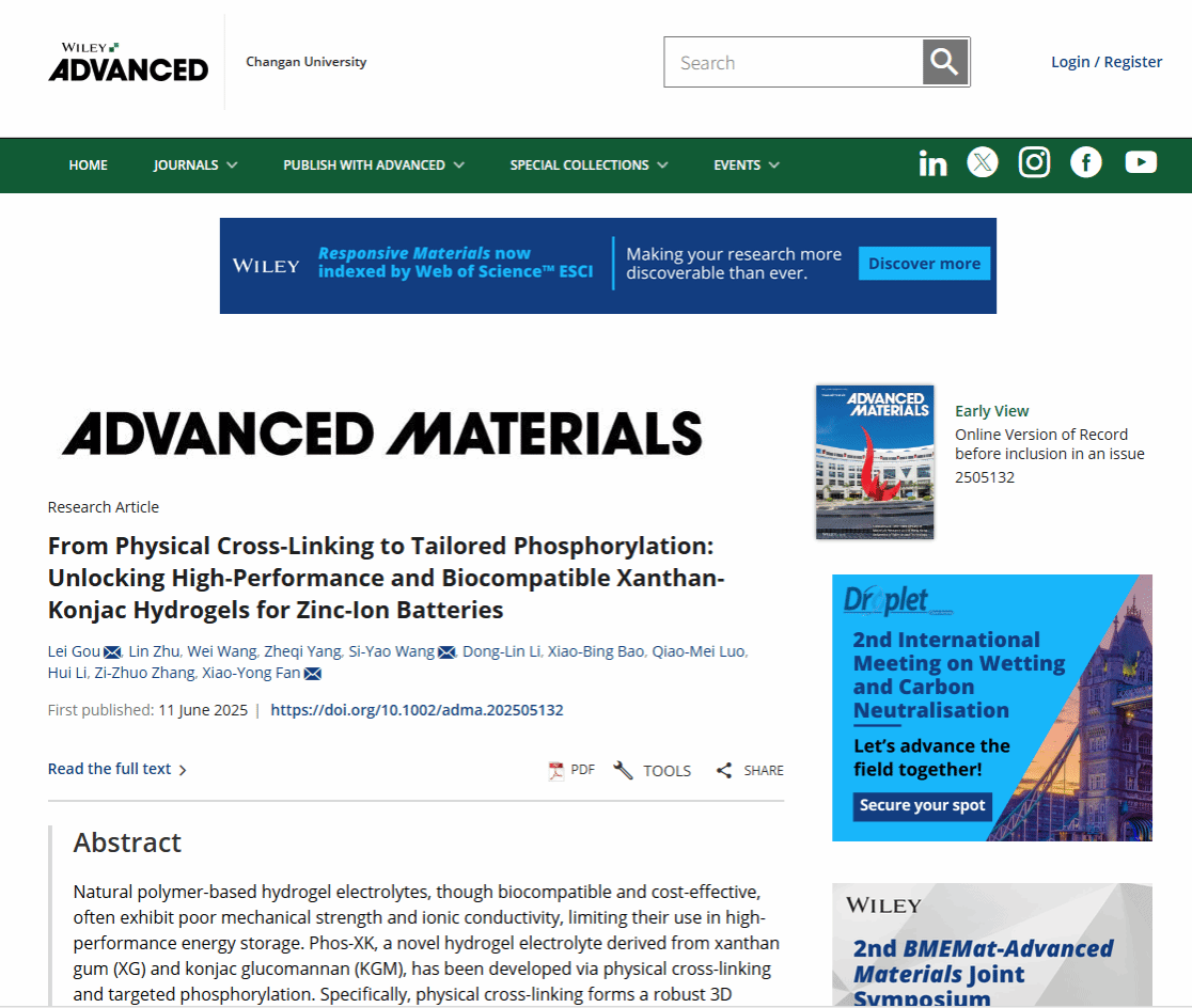 论文信息:Lei Gou, Lin Zhu, Wei Wang, Zhe-Qi Yang, Si-Yao Wang, Dong-Lin Li, Xiao-Bing Bao, Qiao-Mei Luo, Hui Li, Zi-Zhuo Zhang, Xiao-Yong Fan, From Physical Cross-Linking to Tailored Phosphorylation: Unlocking High-Performance and Biocompatible Xanthan-Konjac Hydrogels for Zinc-Ion Batteries. Adv. Mater. DOI:10.1002/adma.202505132.