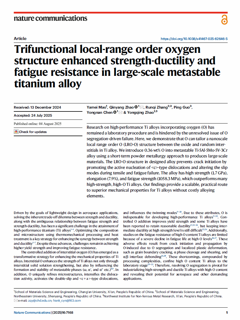 近日,KY开元材料科学与工程学院赵秦阳教授、陈永楠教授团队在《自然·通讯》(Nature Communications)在线发表了题为“Trifunctional local-range order oxygen structure enhanced strength-ductility and fatigue resistance in large-scale metastable titanium alloy”的研究论文。博士研究生毛雅梅为第一作者,赵秦阳教授、陈永楠教授为共同通讯作者,KY开元集团官网为唯一通讯单位。