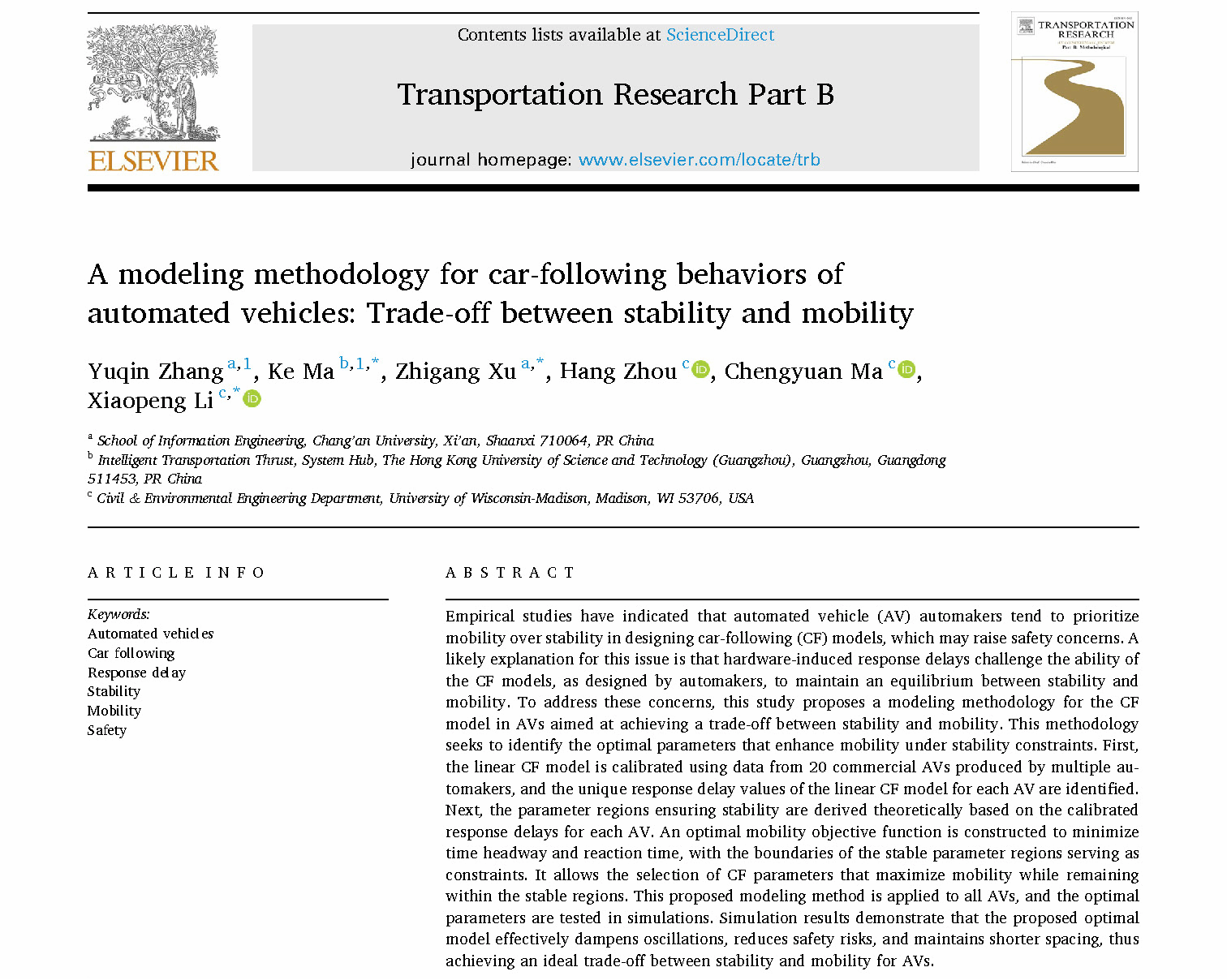 9月16日,KY开元信息工程学院徐志刚教授课题组在交通运输科学领域顶级期刊《Transportation Research Part B: Methodological》上发表了题为《A Modeling Methodology for Car-Following Behaviors of Automated Vehicles: Trade-off Between Stability and Mobility》的研究论文。徐志刚教授为论文通信作者,其博士生张宇琴为第一作者,KY开元集团官网为第一作者单位。