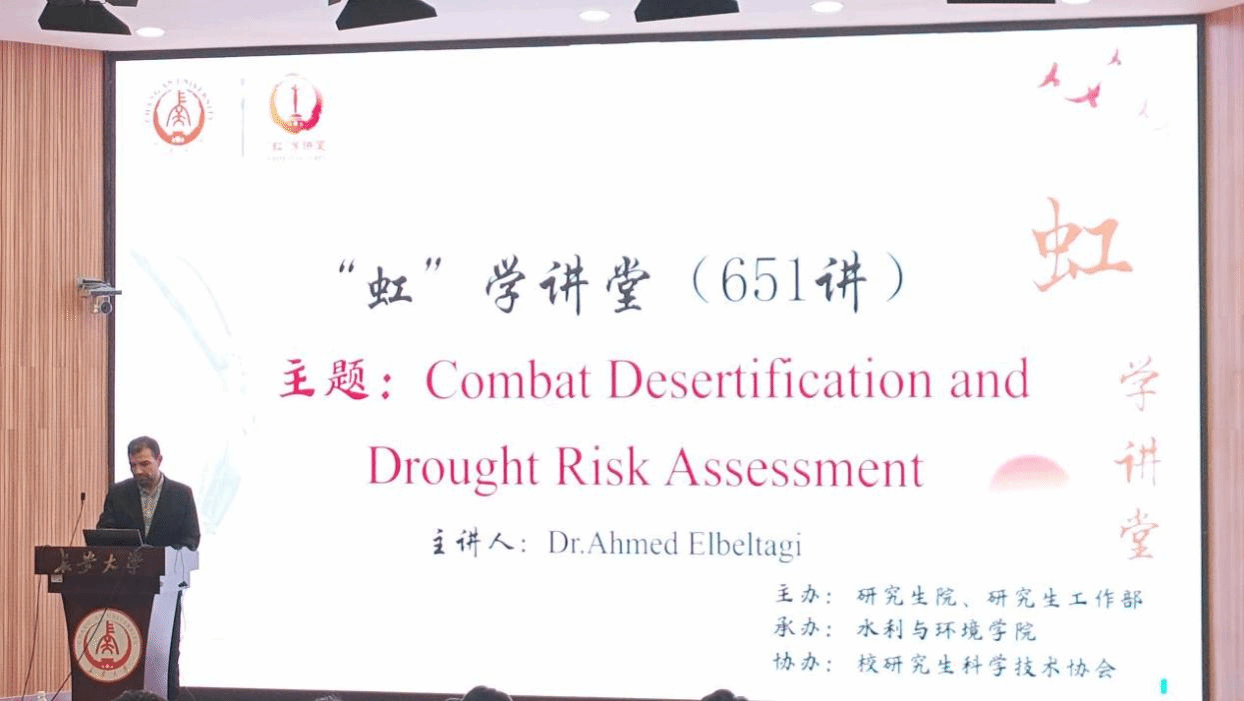 9月17日下午,由研究生院、研究生工作部主办,水利与环境学院承办,校研究生科学技术协会协办的“虹”学讲堂第651讲在南校区东院伯声报告厅举办。河海大学Ahmed Elbeltagi研究员作题为“Combat Desertification and Drought Risk Assessment”的报告,相关学院共150余名师生参加讲座。
