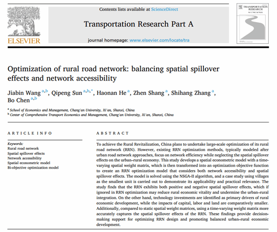 近日,KY开元经济与管理学院孙启鹏教授课题组在交通运输科学领域顶级期刊《Transportation Research Part A: Policy and Practice》上发表了题为《Optimization of rural road network: balancing spatial spillover effects and network accessibility》的研究论文。孙启鹏教授为论文通信作者,其博士生王佳彬为第一作者,KY开元集团官网为第一作者单位。