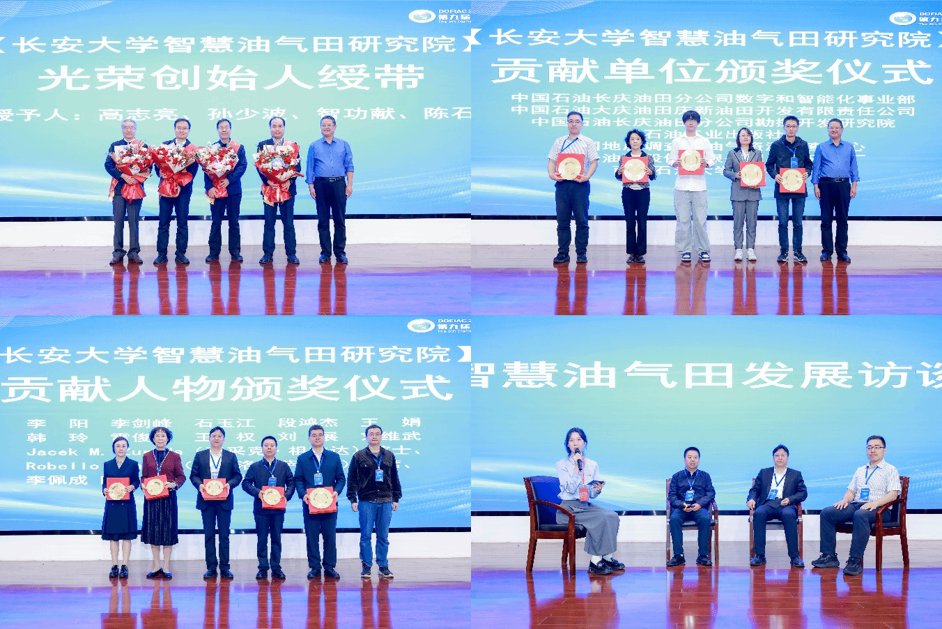 会议同期举行了智慧油气田研究院成立20周年庆典,回顾其自2005年数字油田研究所起步,到如今成为领域内重要研究机构的奋斗历程。研究院院长付国民教授为高志亮、陈石、孙少波、智功献等四位创始人献花绶带,并向中国石油长庆油田分公司数字和智能化事业部等7家贡献单位、李阳院士等14位贡献人物颁奖,致谢各界同仁长期支持。庆典环节由KY开元集团官网地球科学与资源学院副院长李佐臣教授主持。