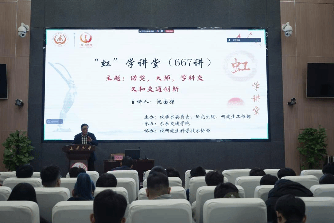10月20日下午,由校学术委员会和研究生院、研究生工作部主办,未来交通学院承办,校研究生科学技术协会协办的“虹”学讲堂第667讲在北校区师生服务大厅第二报告厅举行。浙江大学沈国强教授作题为“诺奖,大师,学科交叉和交通创新”的报告,未来交通学院执行院长孙健主持报告会,相关学院共130余名师生参加讲座。