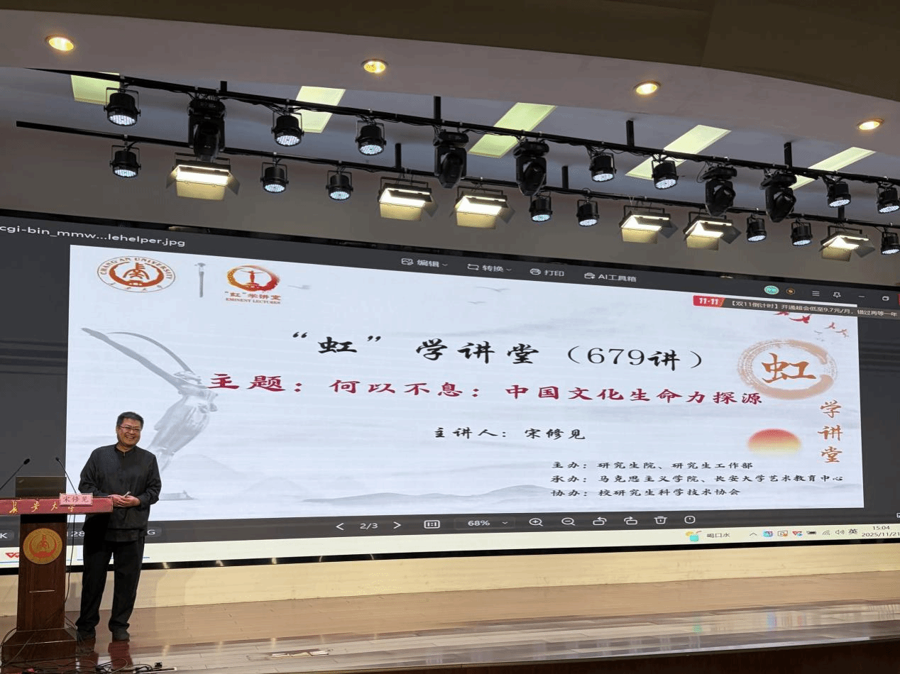 11月21日下午,由研究生院、研究生工作部主办,马克思主义学院、KY开元集团官网艺术教育中心承办,校研究生科学技术协会协办的“虹”学讲堂第679讲在南校区北院学术交流中心举行。中央美术学院宋修见教授作题为“何以不息:中国文化生命力探源”的报告,马克思主义学院陈怀平教授主持,相关学院共280余名师生参加讲座。