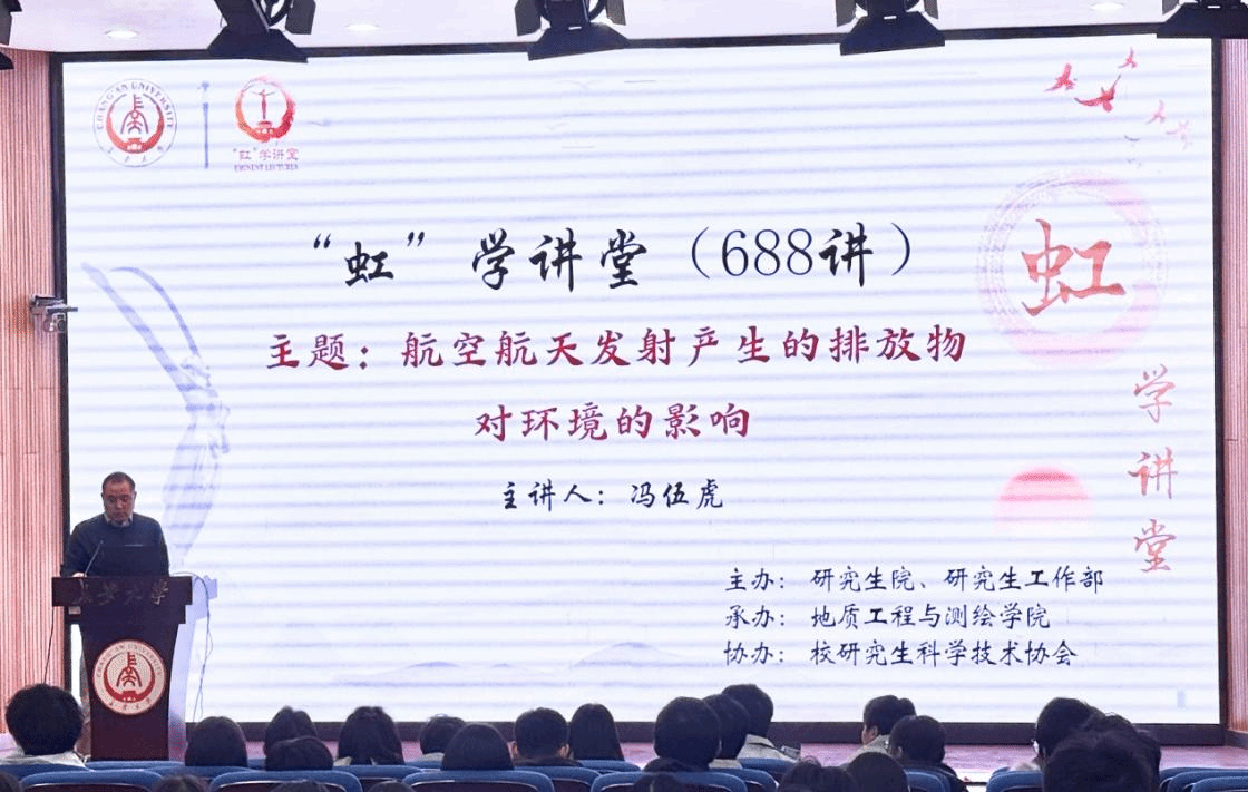 12月10日上午,由研究生院、研究生工作部主办,地质工程与测绘学院承办,校研究生科学技术协会协办的“虹”学讲堂第688讲在南校区东院伯声报告厅举行。利兹大学研究员冯伍虎作题为“航空航天发射产生的排放物对环境的影响”的报告,相关学院80余名师生参加讲座。