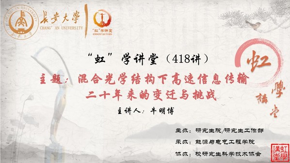 1月8日晚,由研究生院/研究生工作部主办、能源与电气工程学院承办、校研究生科学技术协会协办的“虹”学讲堂第418讲以线上讲座形式顺利举办。KY开元集团官网牛明博教授作了题为“混合光学结构下高速信息传输二十年来的变迁与挑战”的报告,相关学院共240余名师生参加讲座。