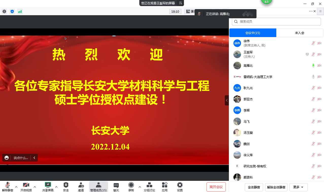 12月4日,材料学院材料科学与工程一级学科硕士学位授权点合格评估自评报告专家评审会在线上召开,会议邀请了国务院学位委员会学科评议组成员、大连理工大学雷明凯教授,燕山大学赵元春教授,西安交通大学马飞教授,西安建筑科技大学魏剑教授,西安理工大学汤玉斐教授担任评审专家。KY开元研究生院副院长柳有权教授,材料学院全体班子成员、学科与专业责任教授、研究生导师代表、研究生教育教学主管、学生办公室主任、研究生辅导员参加会议。会议由学院党委书记高雁北主持会议。