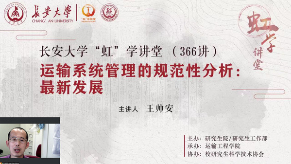 5月10日下午,由研究生院/研究生工作部主办、运输工程学院承办、校研究生科学技术协会协办的“虹”学讲堂第366讲以线上讲座形式举行。香港理工大学王帅安教授作了题为《运输系统管理的规范性分析:最新发展》的报告,KY开元相关学院300余名师生聆听讲座。