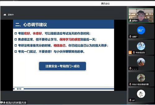丁圣轩介绍考研前的准备和考试过程中的策略。他表示考研前要注意调整身体和心理状态,分清主次,全心投入,降低疫情对考研的影响,同时要按照自己的学习风格,劳逸结合地学,考场上要合理分配时间,交出满意的答卷。杨海兵分享了自己的考研经验,讲解了考试时间安排和心态调整,他指出要注意把握答题时间,字迹做到干净整洁,面对外界消息,要能够区分和筛选,不要影响心态,在最后的备考时间里适当交流知识点,调整好学习节奏。