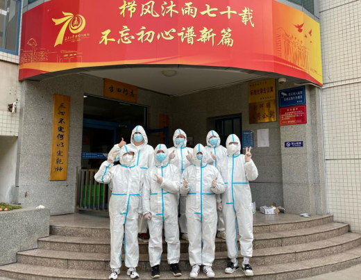 2018级预备党员刘飞宏、2019级预备党员黄沐楷、李明阳负责引导同学们有序排队做核酸,并协调楼内同学下楼做核酸的时间,每日的核酸检测完成后,三位同学的声音均已沙哑;2018级预备党员艾奇、朴辛遥同志负责20号公寓楼配送餐和生活物资分拣、配送工作,每次完成配送,脱掉防护服,他们都是大汗淋漓。面对时艰,第一党支部全体党员迎难而上,冲锋在前,践行着共产党人“为人民服务”的宗旨,守护着我们的美丽校园和同学们的生命安全。