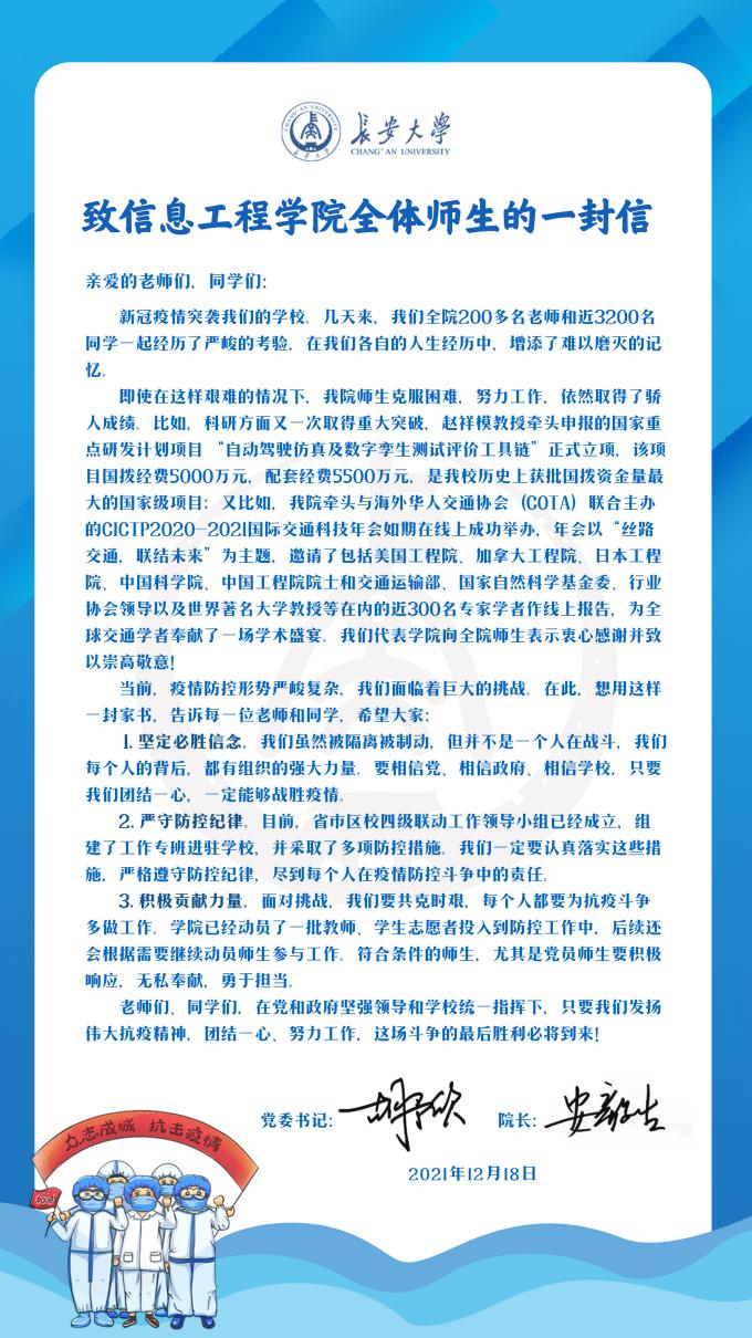 学院党委书记胡予欣、院长安毅生向全院师生发出了《致信息工程学院全体师生的一封信》。组织全院师生开展核酸检测以及密接人员排查,组织人员及时上报抗疫工作相关信息,在师生中征集志愿者为师生做好服务,院长安毅生等带头加入了志愿者队伍,组织各系教师认真做好线上教学工作,保障教学工作顺利开展,动员研究生导师、辅导员、班主任和思政班主任及时开展线上心理辅导、线上指导学业,坚定同学们的信心,激励同学们的斗志,安抚同学们的情绪,对同学们提出的问题进行耐心解答。