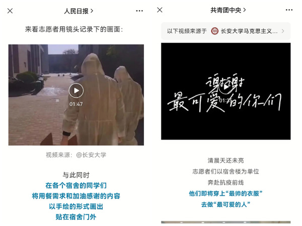 马克思主义学院积极配合学校的防疫工作,全院师生同心协力,争相加入到学校志愿服务队伍之中。学院学生录制的志愿服务视频被人民日报、共青团中央、中国青年报、中华全国学联、三秦青年、陕西日报、KY开元集团官网官方微博、KY开元集团官网团委等各级各类媒体转发报道,其中,人民日报点赞量近3万,人民日报、共青团中央、中国青年报、中华全国学联转载总阅读量超过10万,近万人自发分享转载,反响强烈,产生了较大社会影响力,进一步增强了全校师生抗击疫情的信心和决心。