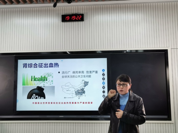 刘小静介绍了肾综合征出血热的发现、发展、研究历史,介绍了肾综合征出血热的致病原理、传播途径以及危害、临床表现、治疗原则及预防措施。她强调,平时要注意保持良好个人及环境卫生、经常使用肥皂和清水洗手、均衡饮食、合理运动、避免疲劳、开窗通风、保持室内清洁,如果出现感冒、发热等情况要及时就医治疗。