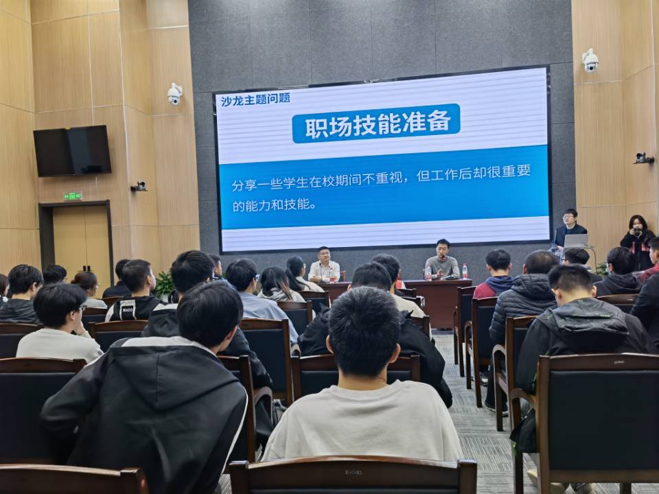 两位嘉宾分别从求职思路、职业规划、职业能力提升、就业与考研抉择、职场人际交往等方面与同学们分享了自己的经历和经验,现场解答了同学们在求职过程中遇到的难点和困惑。同学们积极参与,气氛热烈。