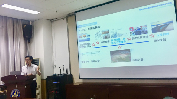 公路学院罗晓瑜副教授在“明暗双线法课程思政教学设计”主题报告中,以“盐与水”的比喻来说明课程思政与专业课知识之间的关系,详细介绍了专业课中课程思政教学设计思路和容易遇到的问题。
