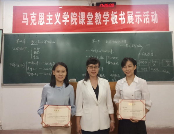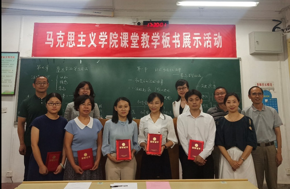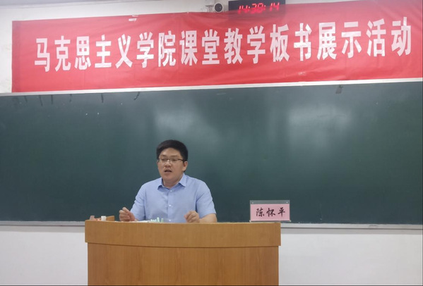 7月2日,马克思主义学院首届课堂教学板书展示活动在校本部北院主楼B147教室成功举行。马克思主义学院党委书记李小芹、院长陈怀平出席活动,人文学院副院长侯长生、理学院副院长商泽进、外语学院副院长张秀见应邀担任评委,马克思主义学院教师代表观摩了展示活动,活动由副院长王立洲主持。