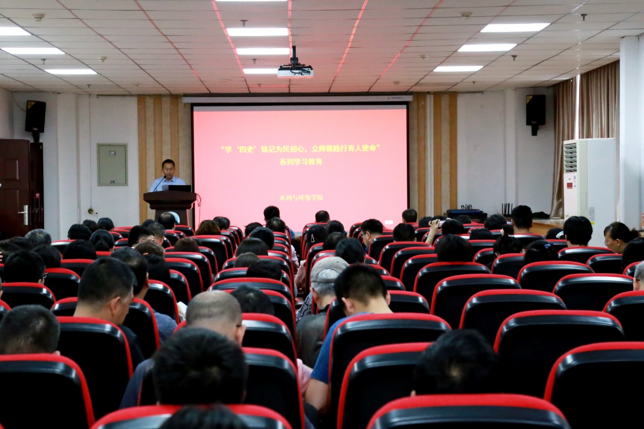 为贯彻落实学校师德专题教育启动部署会议精神,深入开展“四史”学习教育,引导全院教师切实担负起“立德树人”的职责使命,水环学院组织策划了“学‘四史’铭记为民初心,立师德践行育人使命”系列学习教育。5月26日下午,学院邀请党委教师工作部副部长李晓阳做系列学习教育第一讲,题为《坚持高线引领,强化底线要求,做立德修身的“四有”好老师》。学院全体教师参加讲座。讲座由学院党委书记邓红章主持。