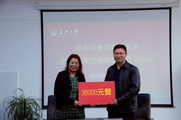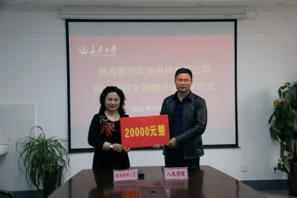 为表达对母校的感恩之情,支持学院教育事业的发展,杨学勤校友代表陕西凯特实业电梯有限公司向母校捐赠20000元。人文学院贺桂华教授代表陕西华秦律师事务所向母校捐赠30000元。学院领导对校友和教师慷慨捐赠的善举表示衷心感谢,并明确校友捐赠的所有款项将全部用于学生教育和学院发展。
