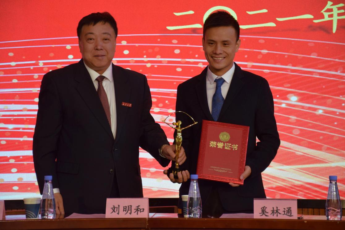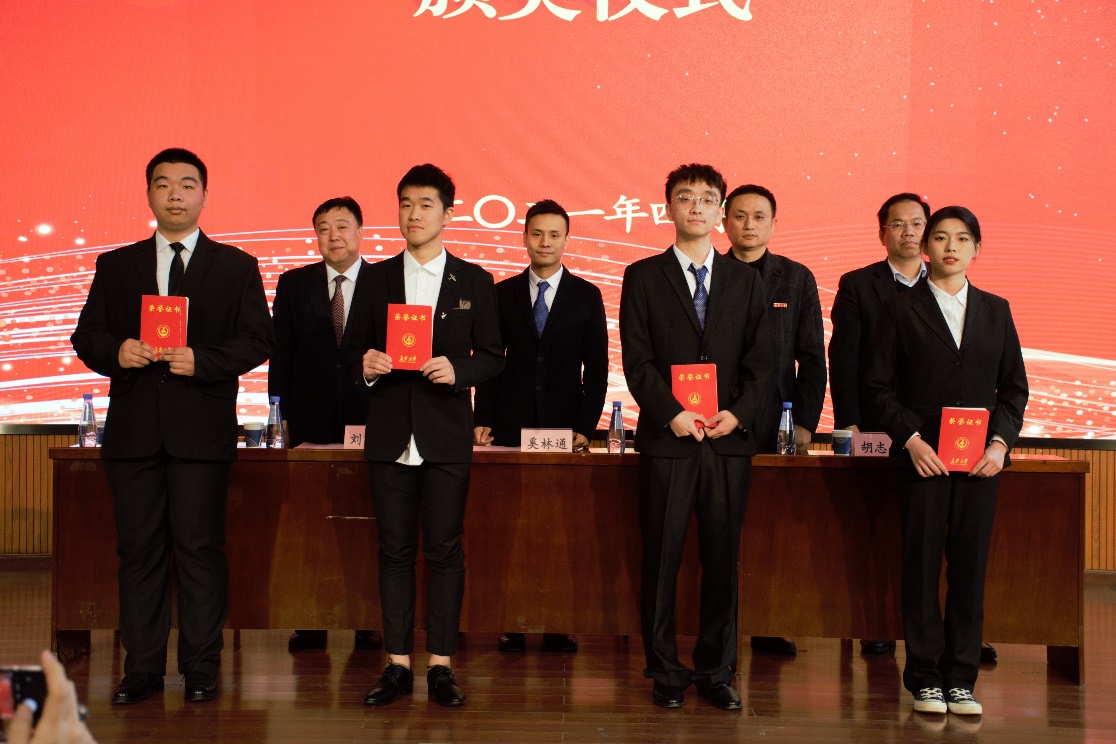 欧阳韬宣读2021年“第一届KY开元集团官网路蓝奖学金”获奖学生名单。与会领导嘉宾为获奖学生颁发荣誉证书。刘明和为奚林通颁发捐赠证书。