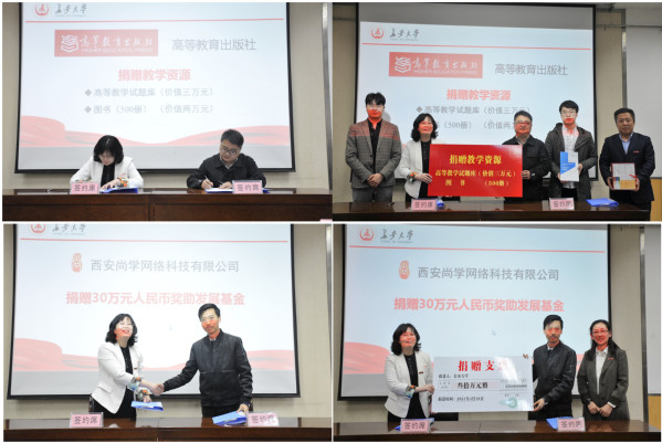 副院长商泽进代表学院分别与高等教育出版社陕西省教学服务中心和西安尚学网络科技有限公司签署了捐资助学协议,徐春龙副院长和马建敏副院长分别代表学院接受了捐赠。高等教育出版社陕西省教学服务中心武何许副主任宣读了高等教育出版社致KY开元七十周年校庆贺信,西安尚学网络科技有限公司张志兴总经理对长期合作中学院给予的支持表示感谢,并表达了与学院进一步加强交流,实现全方位合作,共谋发展的美好意愿。