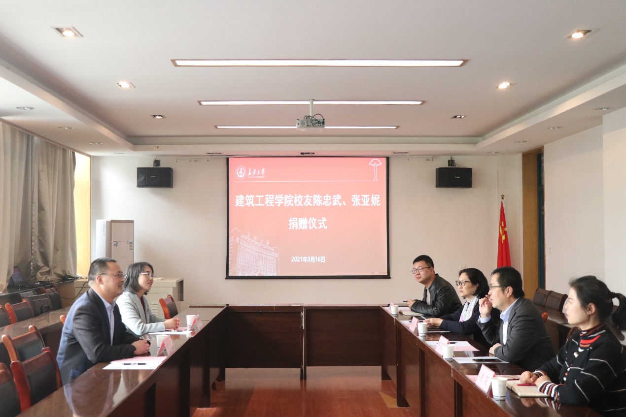 3月16日下午,建工学院在学院第一会议室举行陈忠武、张亚妮校友捐赠仪式,院长邢国华、副书记兼副院长闫秀萍参加捐赠仪式。