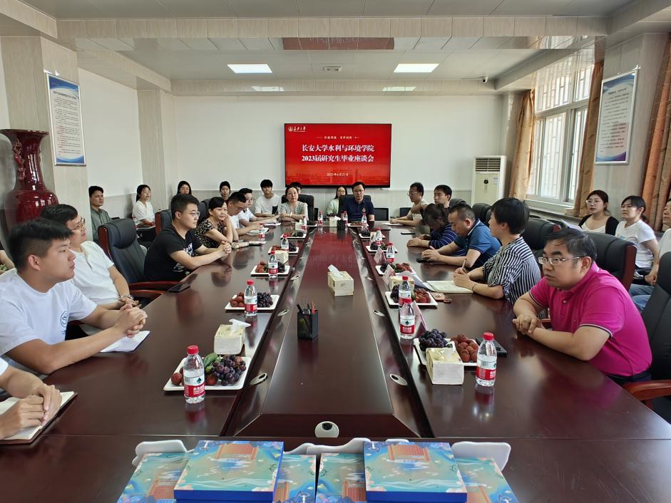 在全校深入开展学习贯彻习近平新时代中国特色社会主义思想主题教育之际,为做好调查研究工作,持续优化我院研究生人才培养方案和培养质量,增进毕业生与学院的情感交流, 6月21日下午,水环学院2023届研究生毕业座谈会在雁塔校区水环楼三楼会议室顺利召开。学院党委书记邓红章,副书记兼纪委书记马明芳,副书记王妍,副院长李培月、段磊,各系室主任,毕业班辅导员及20余名毕业生代表参加了此次座谈会。座谈会由王妍主持。