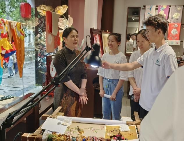 实践队来到苏州平江路参观苏扇作坊,并在老巷子采访中国国礼艺术家、面壁书画传承人顾爱民,在卢建英工作室,队员们与江南大学商学院“姑苏拾遗·茶艺双馨”实践队一同学习苏绣文化,交流学习心得。同学们一致认为非遗文化的传承与发展,不仅是手艺人们的事业,也是当代年轻人义不容辞的责任,青年人必须沉淀学习,才能更好地理解与传承中华传统文化。