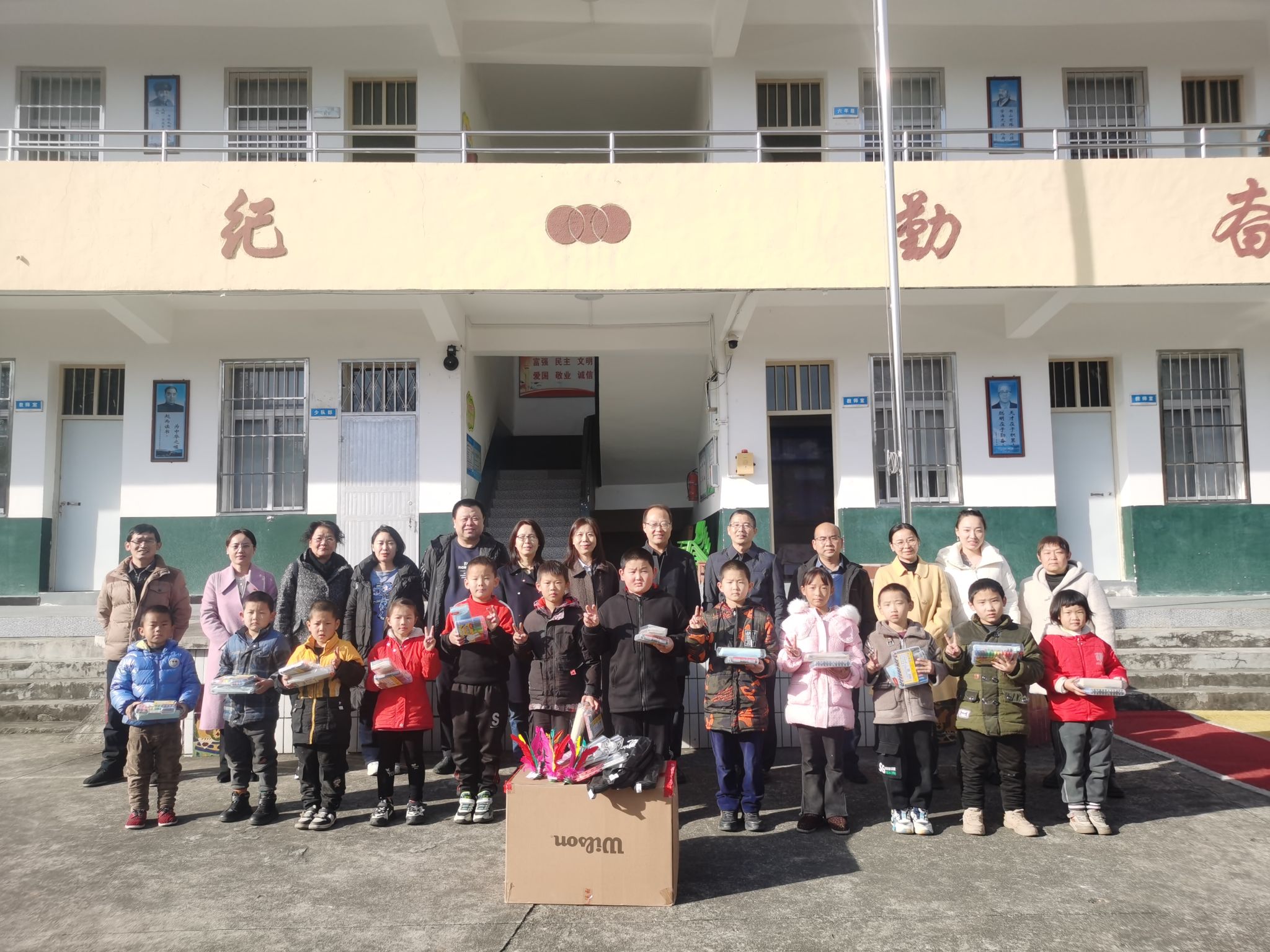 给村教学点学生赠送文具、体育用品
