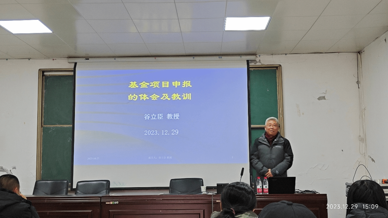 谷立臣教授鼓励所有在座师生积极参加项目申报,并详细介绍了申报项目的经验。谷立臣教授从“普遍存在的问题”谈起,指出申请书中存在的一些常见问题,并通过例举“选题教训”等实例,详细讲解了问题的解决办法。谷立臣教授介绍了“立项依据”“研究方案”等评审关注点,强调“创新点”是申请书的灵魂,并介绍了申请与评审的流程。