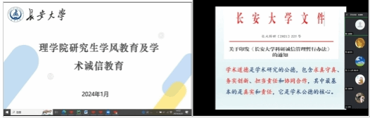 1月12日下午,理学院通过腾讯会议线上召开了研究生学风、学术诚信教育及留校安全教育大会,研究生导师包雄雄、辅导员周小娟主讲,全体研究生参会。