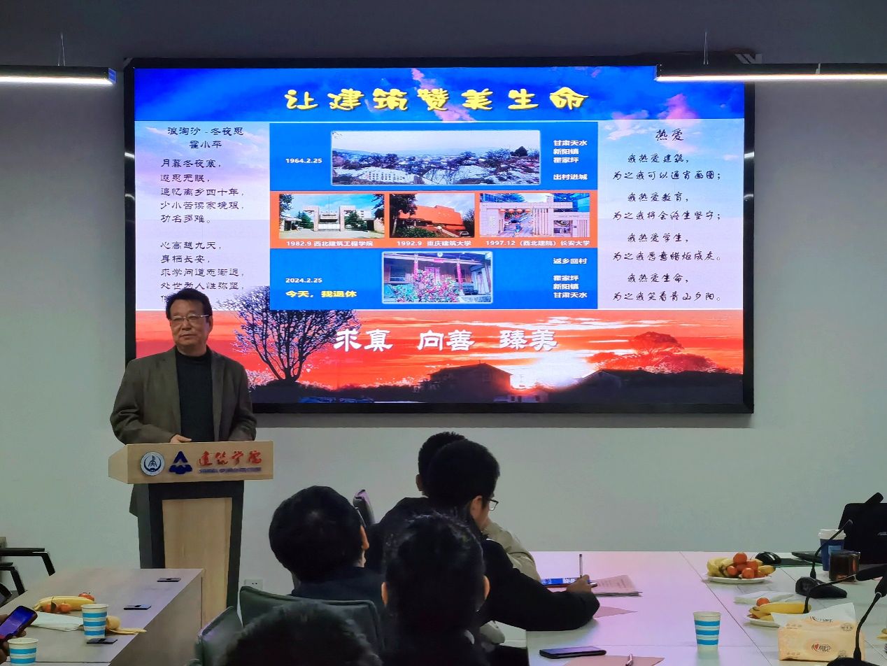 3月4日,建筑学院在南校区建筑馆三楼会议室为霍小平教授举办“岁月如歌 薪火相传”——建筑学院退休教职工荣休仪式。学院领导班子、各系所办主任及教职工代表参会。仪式由学院党委副书记、工会主席刘鹏主持。
