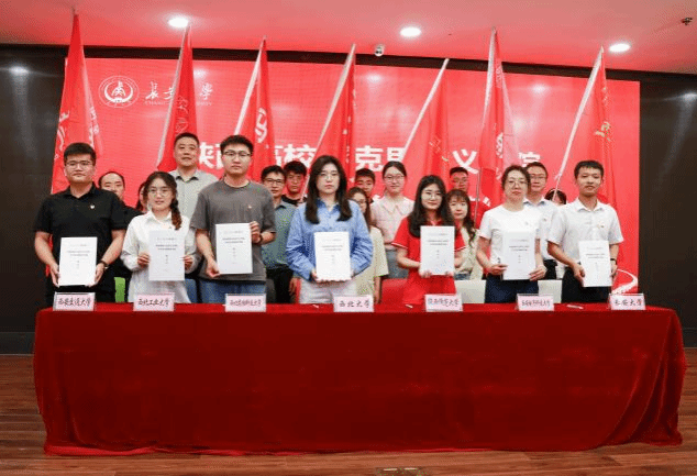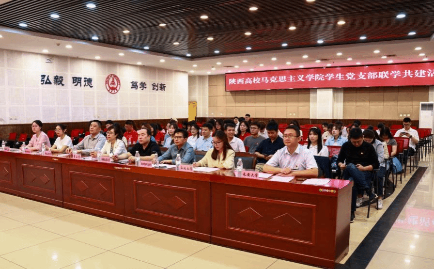 在7所高校马克思主义学院师生的共同见证下,7所高校共建党支部签署了陕西高校马克思主义学院学生党支部联学共建协议书。李小芹为参与此次联学共建活动的7位党支部负责人授旗。