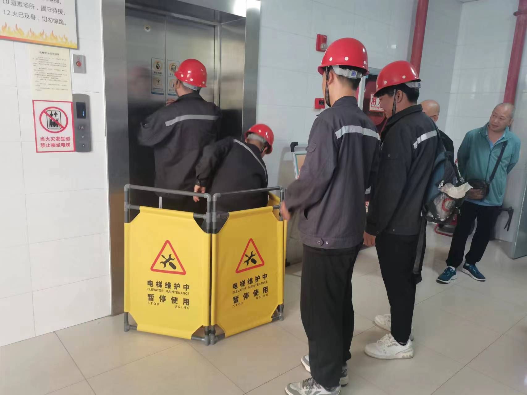演练中,被困人员通过电梯内的紧急呼叫装置求救;值班室接到求救信号后及时通知电梯维保救援人员赶赴救援,并及时安抚被困人员;救援人员接到通知后,迅速赶赴现场,设置警示牌、拉警戒线,确认被困电梯位置、切断电梯电源,将轿厢停在相应的平层处,用三角钥匙打开层门,协助乘客离开轿厢,关闭层门,成功解救被困人员;维保人员进入电梯开展全面检查,逐一消除故障隐患,试运行确认安全后,故障电梯恢复正常运行。