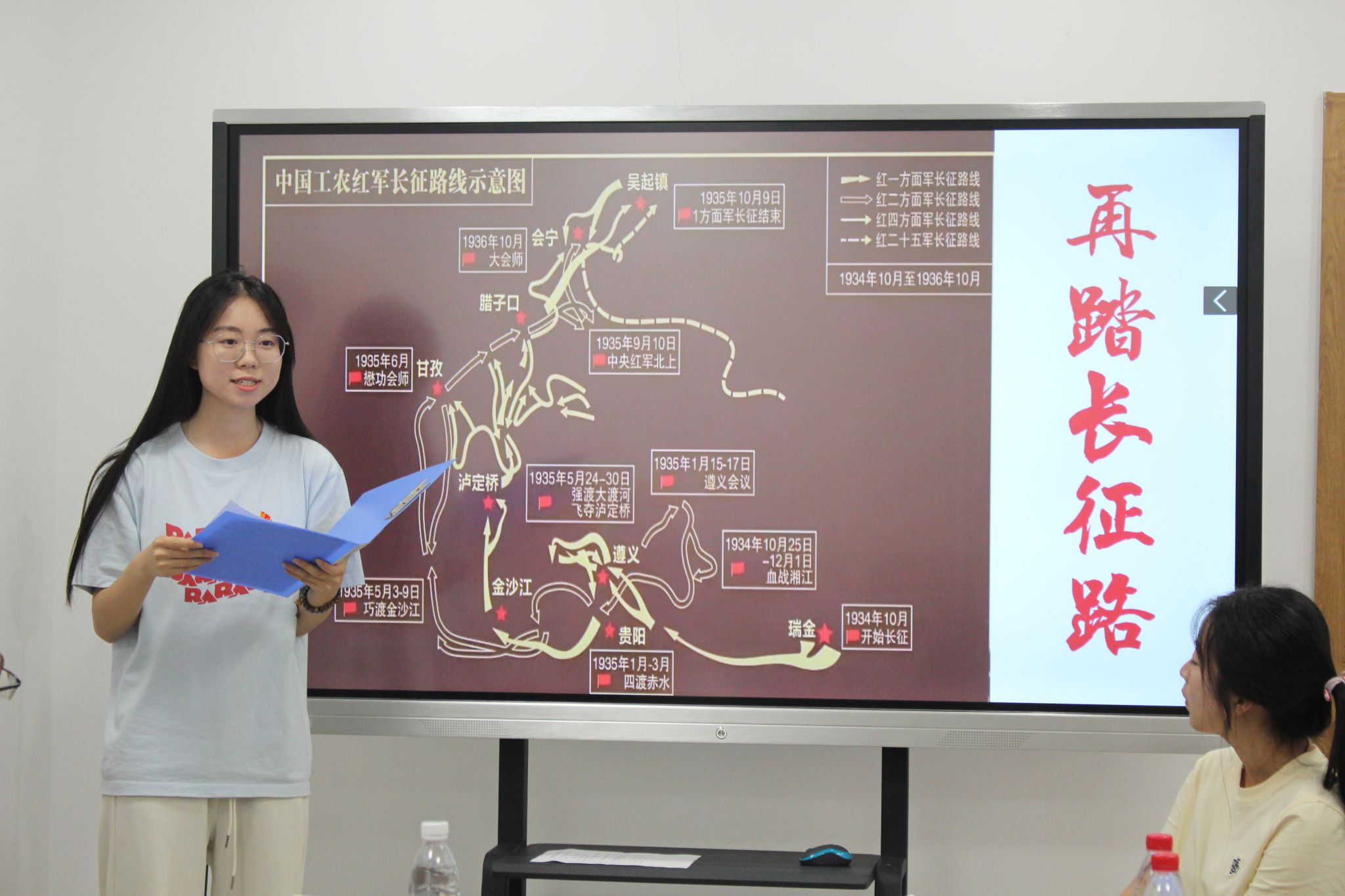 “红色书屋阅读”环节中,大家静静翻阅,倾心感悟。随后,各位入党积极分子起身发言,说出他们心中对于这些书的见解和心得。在“《红岩》情景扮演”环节,组长黄喆恺携手三名组员,呈现了一场简短而精彩的表演。大家无不为之动容,再一次感悟了革命前辈舍生取义的精神。而后,本科生第四党支部的党员们走上前,在长征地图上带领大家重温长征之路。一段“再踏长征路”沙盘演绎诉尽沿途艰险多难,再现红军英勇刚毅的光辉形象。