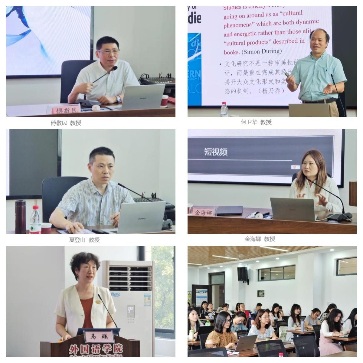 特邀四位知名专家担任主讲,分别为上海大学傅敬民教授、华中师范大学何卫华教授、北京外国语大学夏登山教授及中国传媒大学金海娜教授。讲座共分七场,内容涵盖翻译学、语用学、比较文学与跨文化研究等多个领域,为与会者提供了丰富的学术视野和前沿研究动态。傅敬民教授从习近平新时代中国特色社会主义思想的宏观视角出发,深刻剖析了翻译教育教学的本质,并详细阐述了当前我国翻译教育教学所面临的挑战与困境;夏登山教授对外语教育的挑战与改革进行全面分析,明确指出新时代外语教育的改革方向应从提升语言技能转向学科专业建设,并逐步向思政教育与国家战略服务以及回应社会、满足发展需求的方向迈进;何卫华教授深入探讨了文化研究的内涵、悲剧的概念定义以及文学批评的理解等方面;金海娜教授围绕视听翻译研究进行了深入讲解,详细介绍了影视翻译的理论、方法以及前沿趋势。