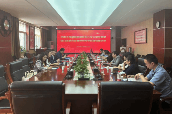 杨伟代表学院对河南工程学院李威副校长一行表示热烈欢迎,并简要介绍学院发展历史、专业设置及新商科建设情况。李威感谢学院的热情接待,并介绍了河南工程学院的发展历程、学科专业布局和人才引进政策等方面情况。