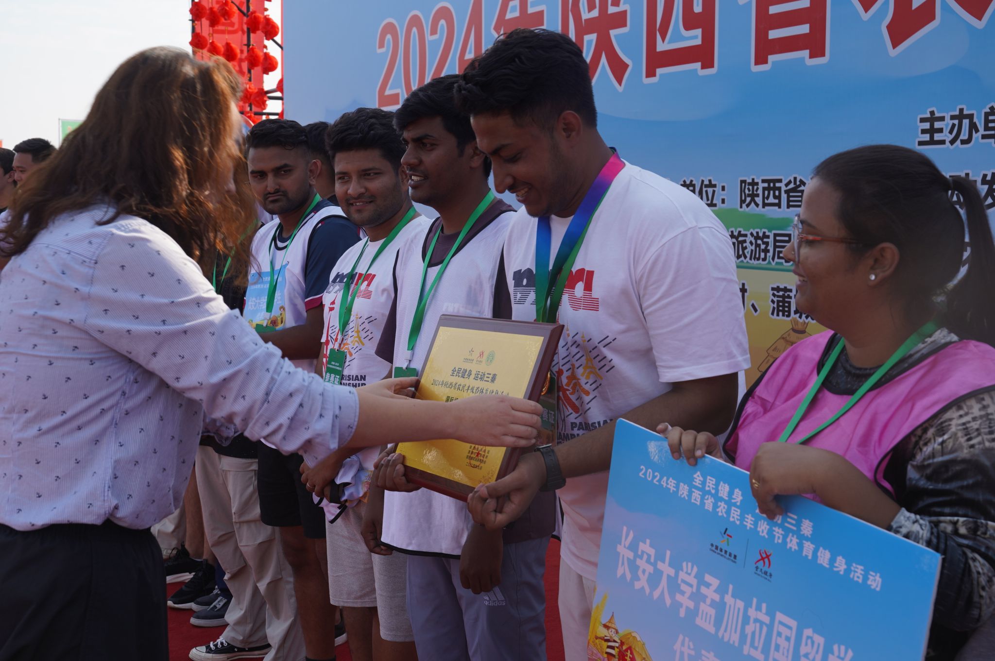 “全民健身 运动三秦 ”2024年陕西省农民丰收节体育健身活动现场气氛热烈,外国留学生的积极参与,极大增加了活动的乐趣与看点。观赛群众的加油声、欢呼声此起彼伏,整个活动现场充满了欢乐与和谐的氛围。国际留学生在丰收运动中感受到了农忙的乐趣,也体验了中华农耕文明的魅力。