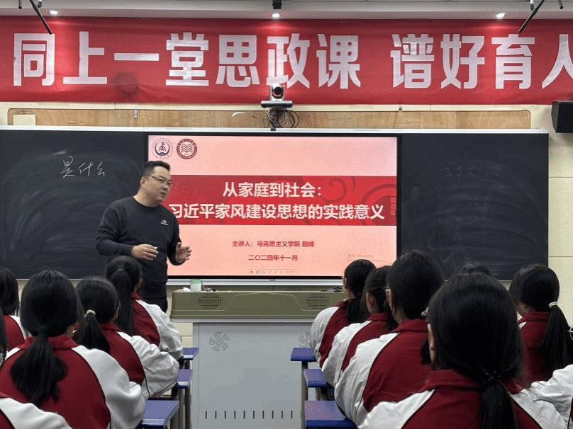 陕西省高校思政课大练兵“教学标兵”、马克思主义学院纪委委员殷峰老师进行《从家庭到社会:习近平家风建设思想的实践意义》课堂教学示范,围绕“是什么、为什么、怎么办”三方面内容开展家风建设教育,号召同学们把爱家和爱国统一起来,把实现个人梦、家庭梦融入国家梦、民族梦之中。