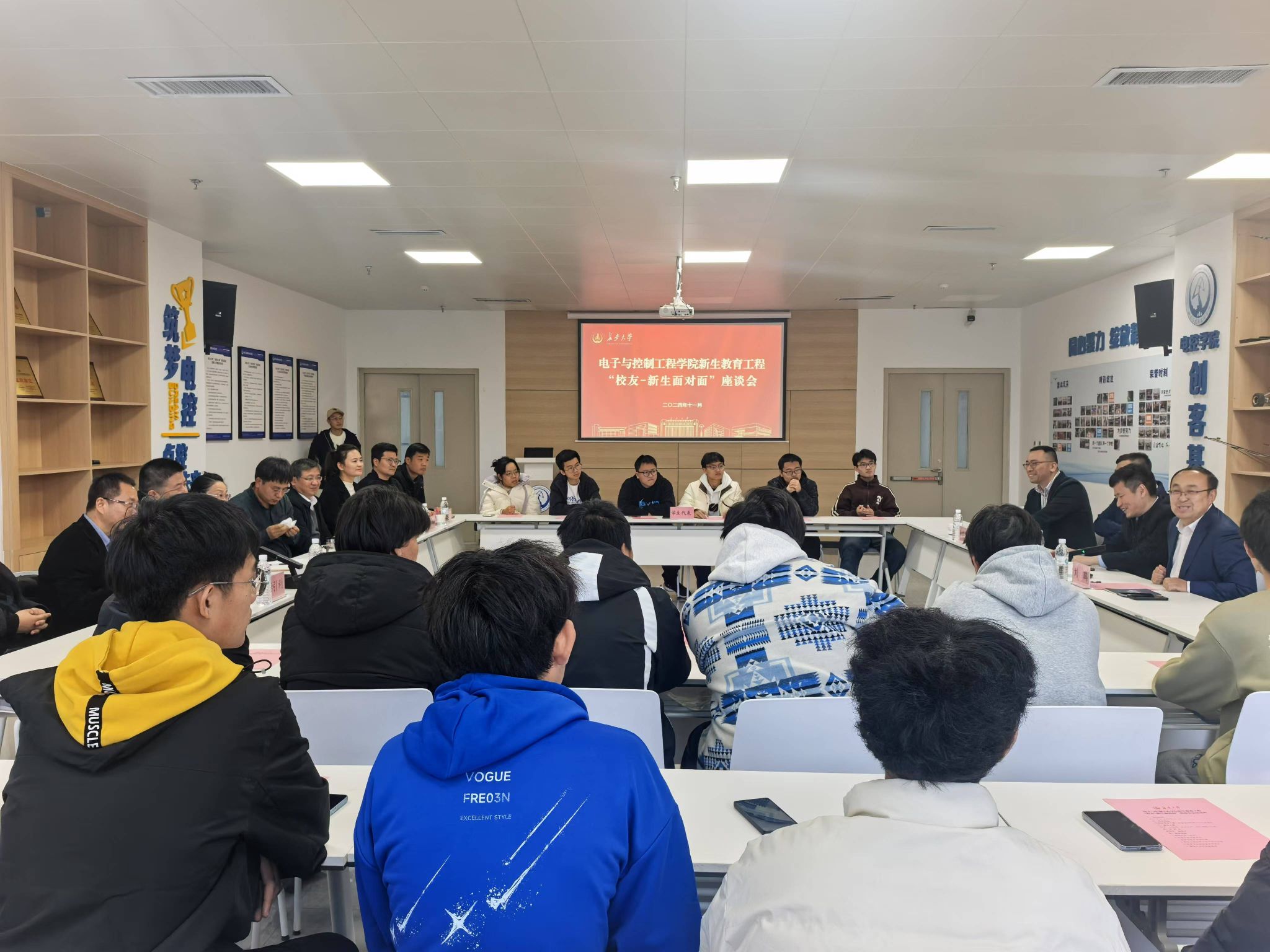 为凝聚校友力量,助推学院事业发展,构建协同育人工程,11月25日,电控学院邀请西安金路交通工程科技发展有限责任公司董事长杨晓东,中建路桥西北公司总经理刘亮,中交通力智慧院副院长、陕西通力数智公司总经理李英举,西安赛特实业有限公司总经理刘鹏参加“校友-新生面对面”座谈会,学院党政领导、各系主任及50名新生代表出席座谈会,会议由副院长龚贤武主持。