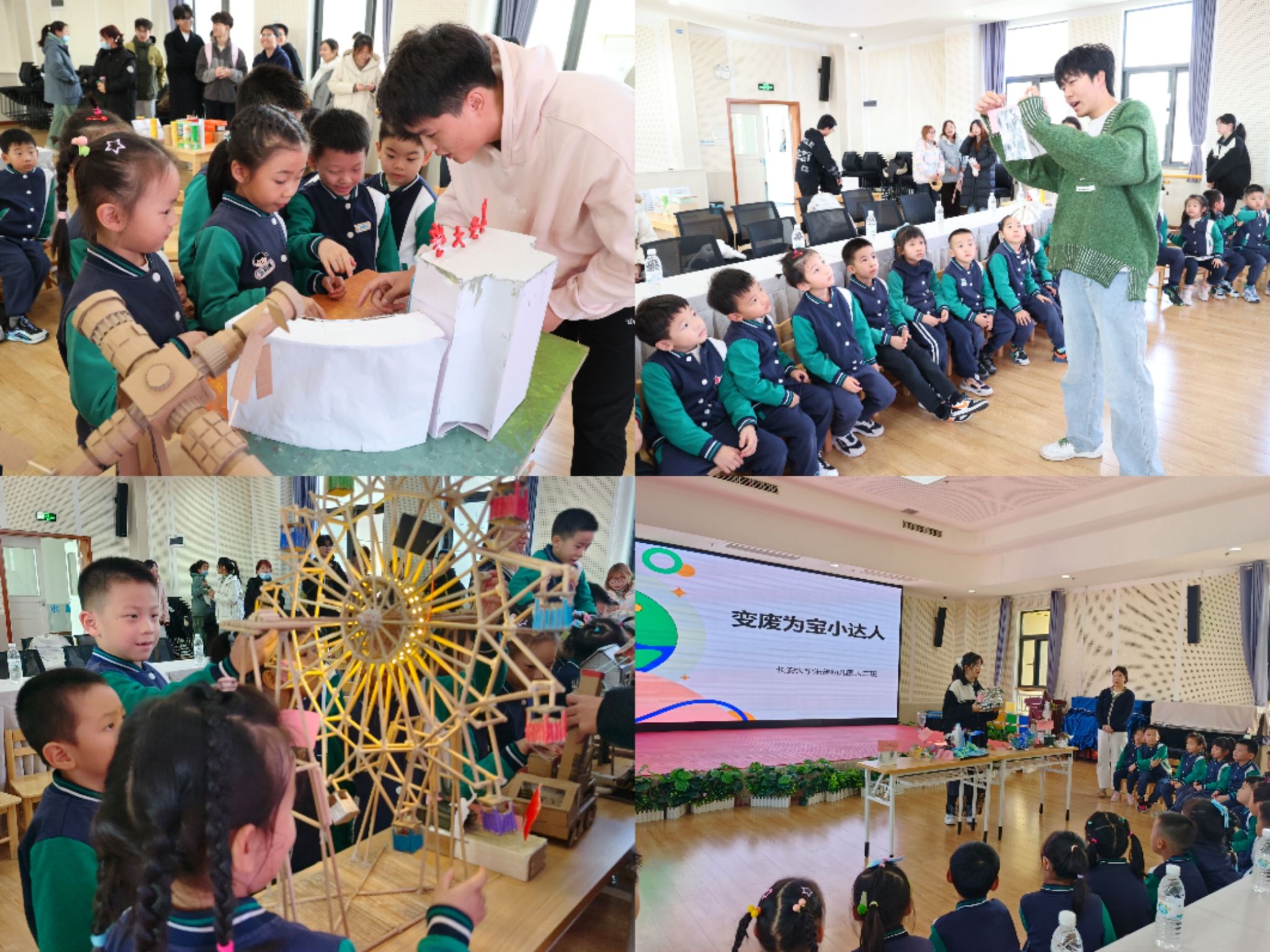 在与幼儿园邹璐瑶老师的共同组织下,学院师生为小朋友们详细介绍了废旧模型大赛获奖的作品设计理念及制作过程,耐心指导小朋友们利用身边的废旧材料制作创意作品,带领小朋友们探索了有趣的“变废为宝”创作过程。