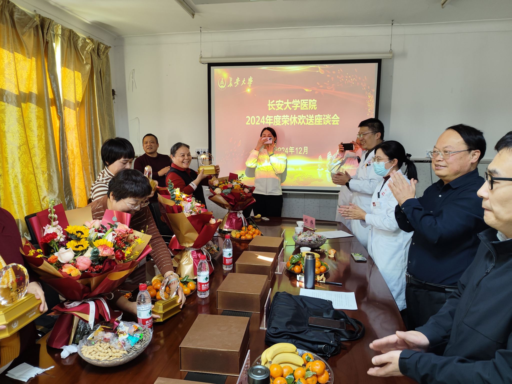 12月31日下午,校医院举办2024年退休职工荣休座谈会,欢送张凤琴、魏宏妮、马艳萍、王莲红、赵淑萍、刘晓卫6位同志光荣退休。医院领导班子、相关科室负责人及职工代表30余人参加座谈会,座谈会由医院工会主席刘伟主持。