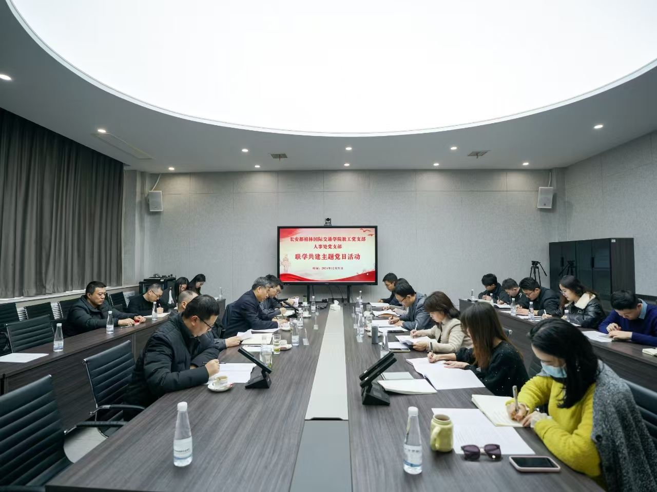 12月31日,长安都柏林国际交通学院教工党支部与人事处党支部在鸿远教学楼四层会议室开展联学共建主题党日活动。副校长范文、人事处处长李险峰、学院党总支书记赵亮以及两个支部全体党员参加本次活动。活动由赵亮主持。