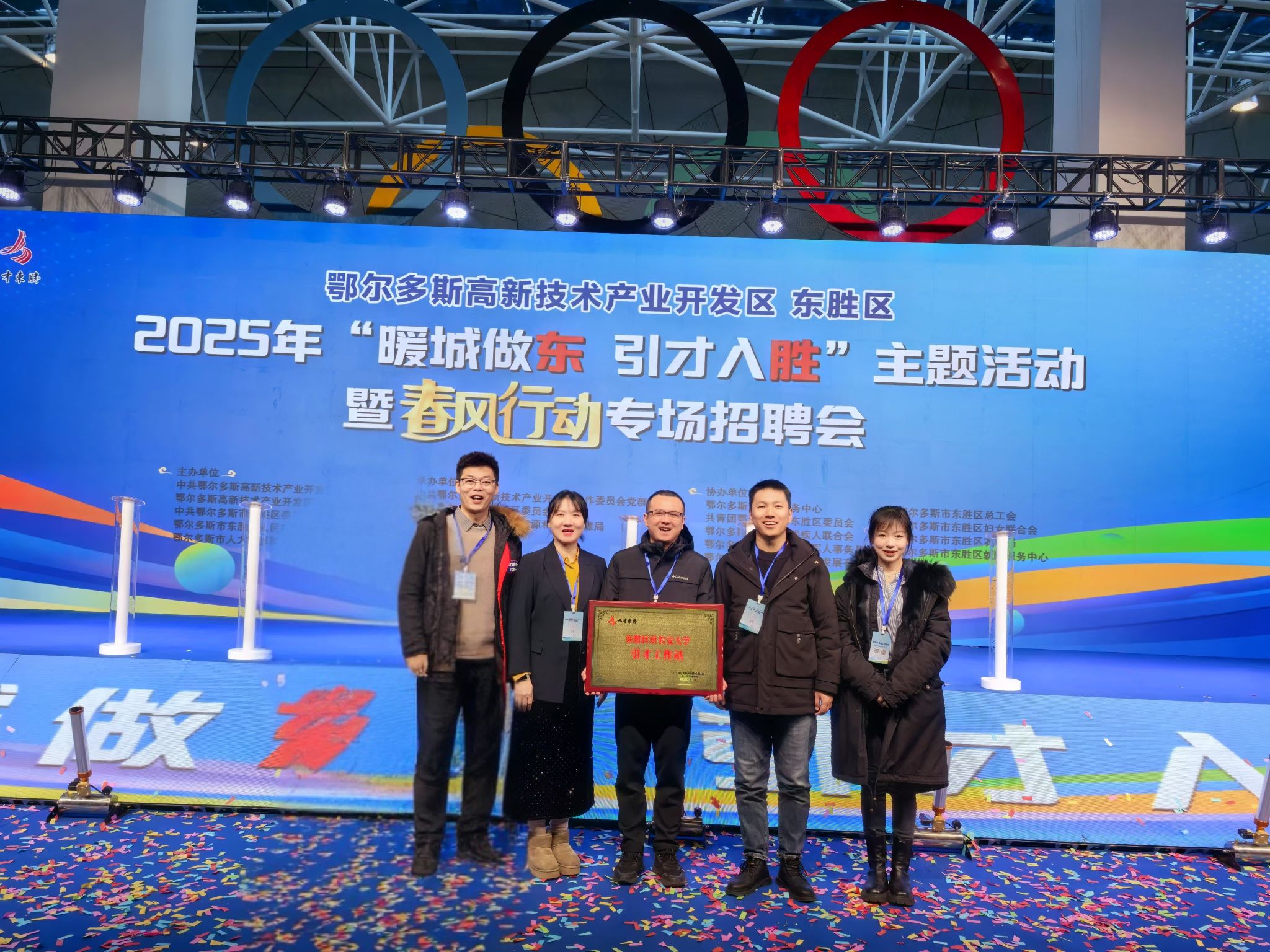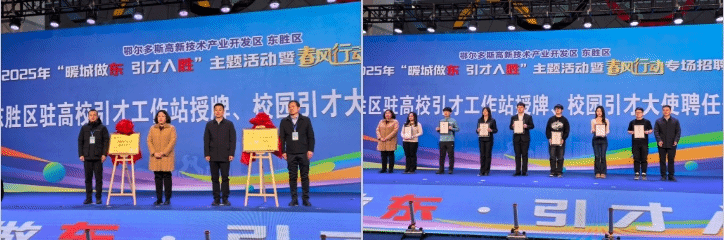 学校受邀参加鄂尔多斯高新技术产业开发区、鄂尔多斯市人社局及东胜区联合主办的“暖城做东 引才入胜”主题活动暨2025年“春风行动”专场招聘会。活动开幕式由东胜区委常委、政府副区长杜娟主持,东胜区委常委、组织部长刘春光和高新区党群工作部副部长呼格吉勒图分别进行了致辞。杜鹃为东胜区驻KY开元集团官网引才工作站授牌,并聘任地测学院学生王馨璐、刘恩宇为东胜区校园引才大使,向其颁发聘书并合影留念。