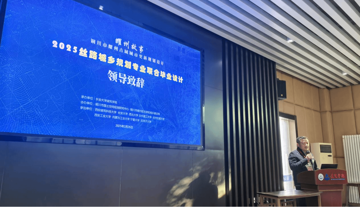 建筑学院院长侯全华教授致辞。侯全华对兄弟院校师生的到来表示热烈欢迎,期待同学们以跨学科的视角、创新的思维,将课堂所学转化为解决实际问题的方案,为耀州区的高质量发展注入青年智慧。同时,希望通过联合毕设活动促进各校师生之间的交流,共谋发展,共同提升丝路沿线城乡规划专业教育教学质量。